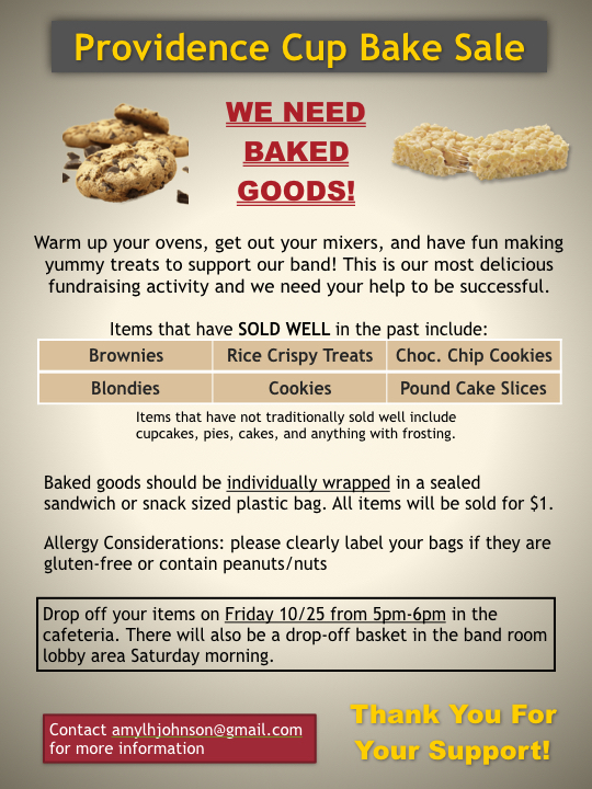 Providence Cup Bake Sale Items needed by Friday, October 25, in the cafeteria.